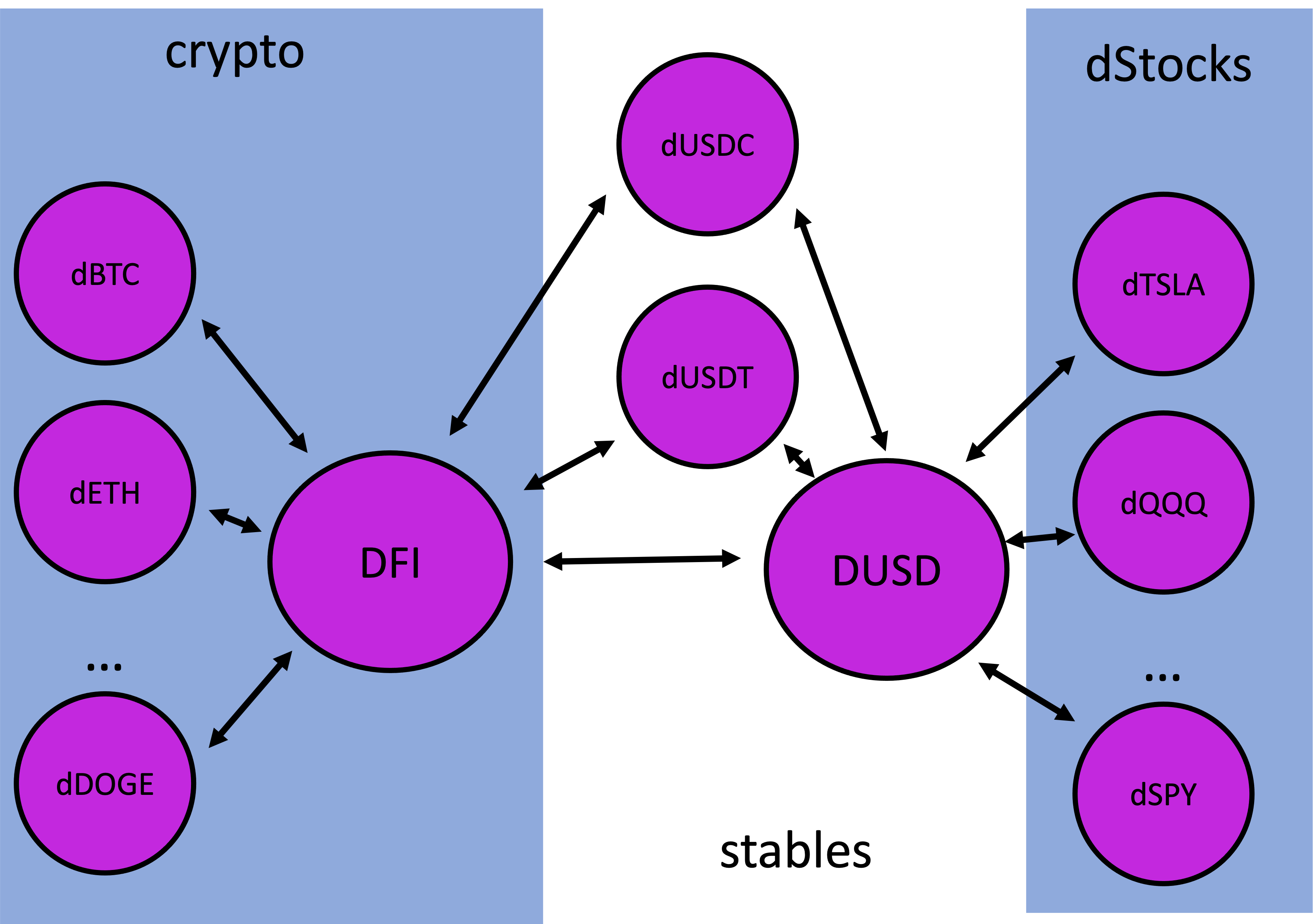 The dStock-pools on the other hand, always trade with DUSD, the stablecoin of the DeFiChain. E.g. sTSLA-DUSD, dQQQ-DUSD, and so on. Also the DUSD can be traded directly with the stablecoins - dUSDT-DUSD and dUSDC-DUSD. A list of the dStocks grouped by asset categories: Tradable dAssets on DeFiChain
