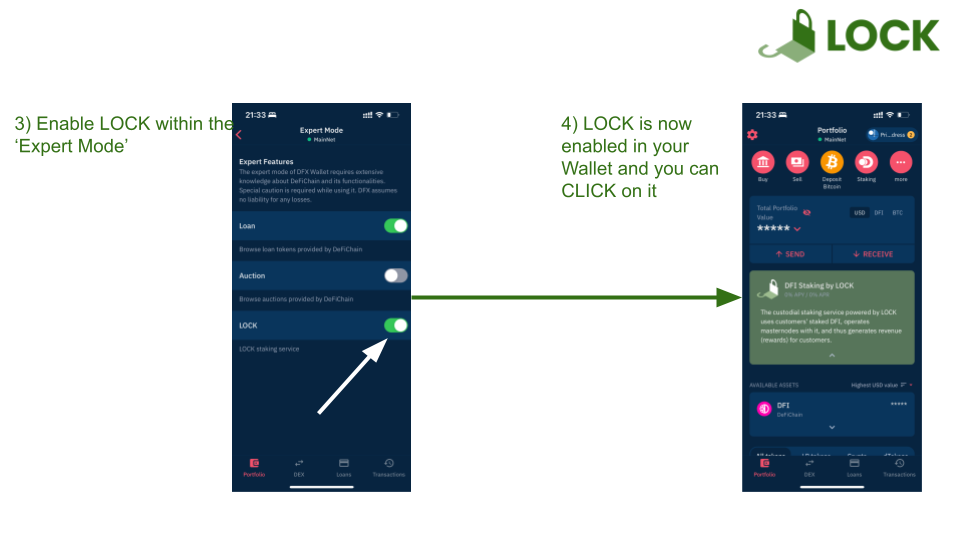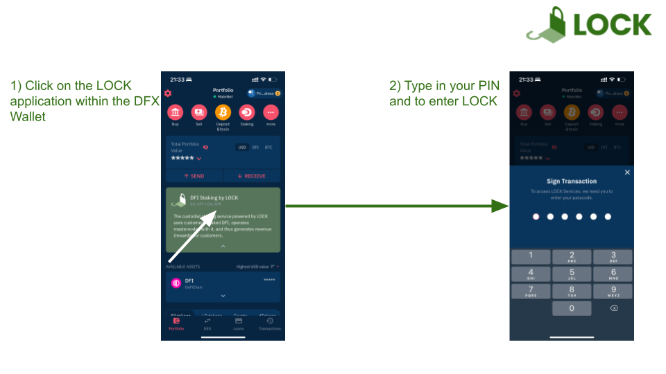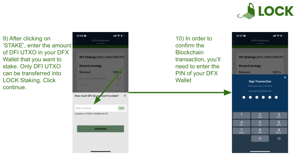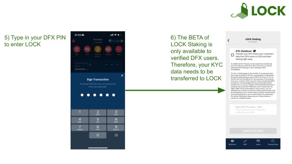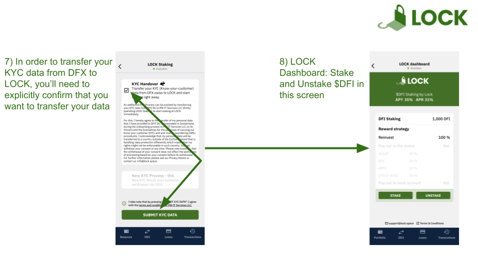 LOCK Staking is integrated natively in wallets like DFX or Jellywallet. DFI Coins (DFI UTXO) can be transferred directly into LOCK Staking within the LOCK application in order to receive Staking rewards onto your wallet address. Your KYC data can be transferred from DFX to LOCK, if youβre a customer at DFX. Otherwise LOCK offers an own KYC process (in V2).
