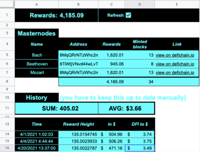 A simple Google Sheets document for tracking your masternodes.See how many blocks your nodes have minted so far, how many rewards are remaining on your collateral addresses and (manually) keep track of your rewards.